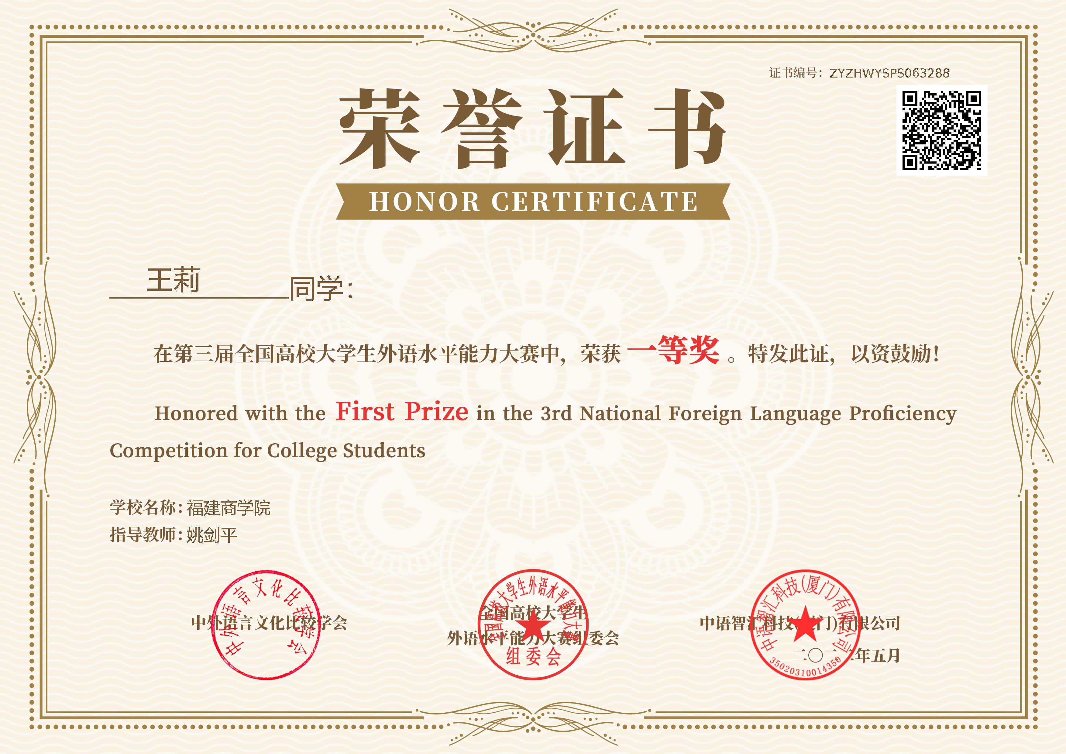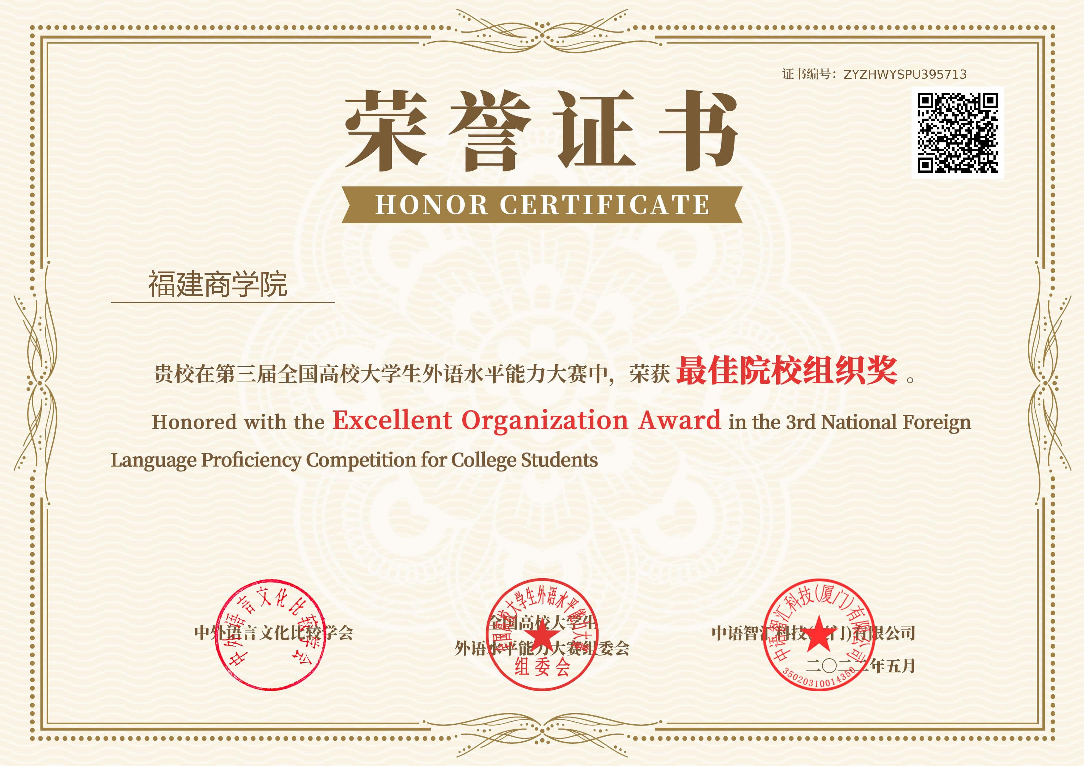 近日,由中外语言文化比较学会举办的第三届全国高校老员工外语水平能力大赛全国总决赛结果公布。本次大赛采取线上比赛的形式,共有来自全国250余所院校的4万多名员工参赛,经初赛、决赛两个环节,公司学子在激烈的竞争中脱颖而出,共获得全国决赛特等奖1项、一等奖1项、二等奖2项的好成绩,展现了福商学子的风采。此外,因为比赛组织有力,选手成绩优异,公司荣获“最佳院校组织奖”。