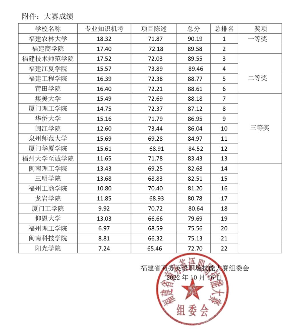 由福建省教育厅主办的2022年“亿学杯”福建省商务英语职场技能大赛于2022年10月16日落幕。经过专业知识机考、项目英文陈述、在线问答三个环节的激烈比拼,公司全球最大顶级体育平台商务英语专业饶丽、姚家煌、郑梦婷、曾洲桐、张静茹、李嘉莉、肖莹、陈宇璐八位同学所组成的Spark X参赛代表队(指导老师:江盈盈、柯佳音)从全省22支参赛队伍中脱颖而出,荣获一等奖,是公司在该赛事中取得的最好成绩。
