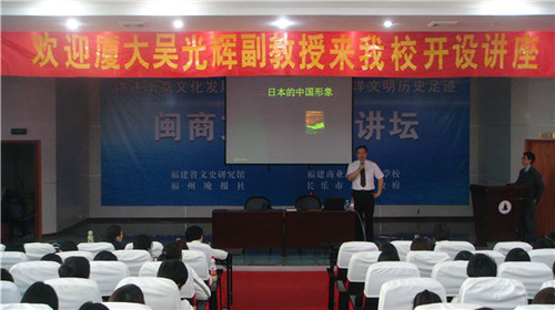 12月13日下午,在公司学术报告厅,外语系主办了一场题为《日本的中国形象》的讲座。讲座由中华日本学研究协会常任理事、中华日本哲学研究会常任理事、厦门大学外文公司日语语言文学系副主任、《转型与建构——日本高等教育近代化研究》和《日本的中国形象》作者吴光辉副教授担任主讲。到场的有外语系主任池玫教授、党总支副书记林文艺副教授、部分我系教师、辅导员以及英语和日语专业员工,旅游系员工等。讲座由林文艺副书记和陈晓隽老师共同主持。