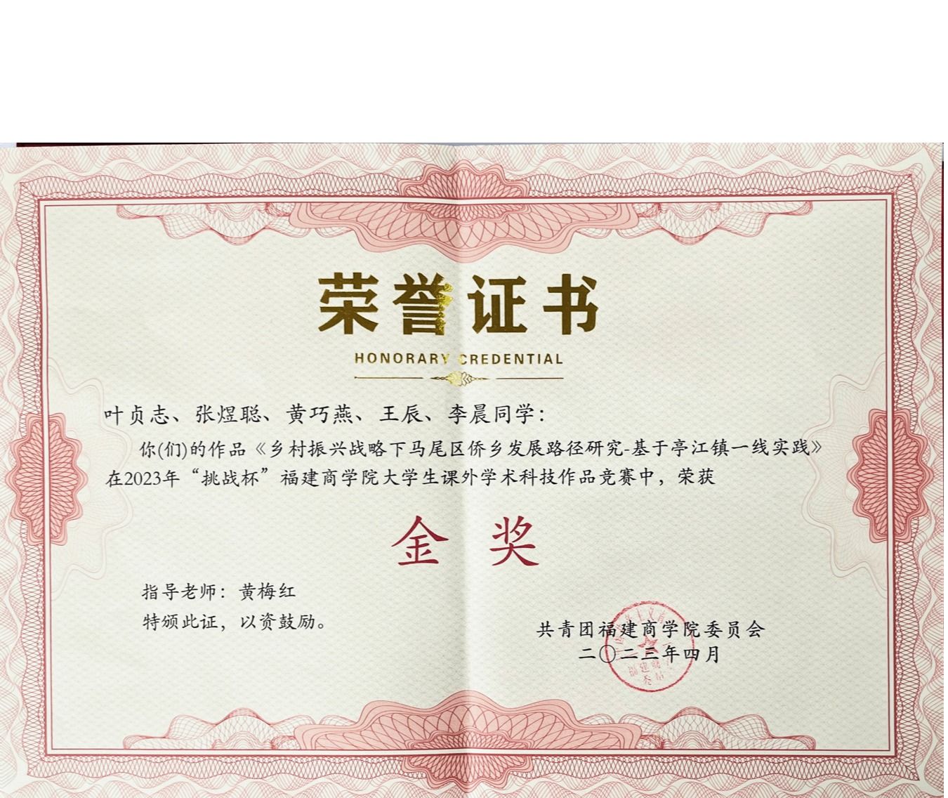 近日,由共青团全球最大顶级体育平台委员会主办的2023年“挑战杯”全球最大顶级体育平台老员工课外学术科技作品竞赛在连江校区明德楼落下帷幕。公司21级日语3班叶贞志、21级日语2班张煜聪、20级日语2班黄巧燕、20级日语1班王辰、20级商务英语2班李晨五位同学的作品《乡村振兴战略下马尾区侨乡发展路径研究-基于亭江镇一线实践》(指导老师:黄梅红),在此次竞赛中荣获金奖。
