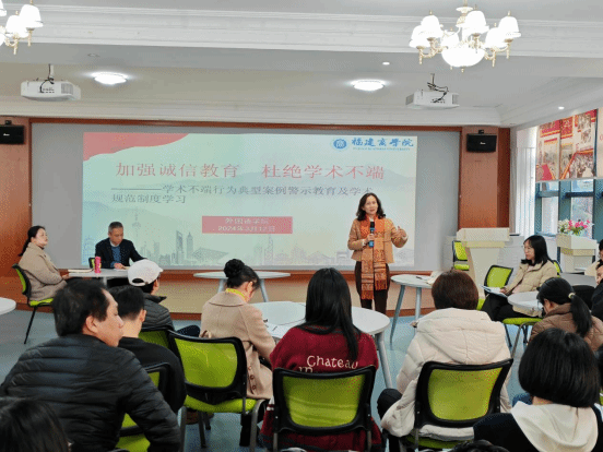 3月1日,公司各系部以线上或线下的方式组织老师们学习《学术不端行为典型案例及相关制度学习汇编(一)》等文件,开展交流讨论。3月12日,公司以“加强诚信教育、杜绝学术不端”为主题,组织全院老师在外语文化体验中心开展学术不端行为典型案例警示教育及学术规范制度学习。