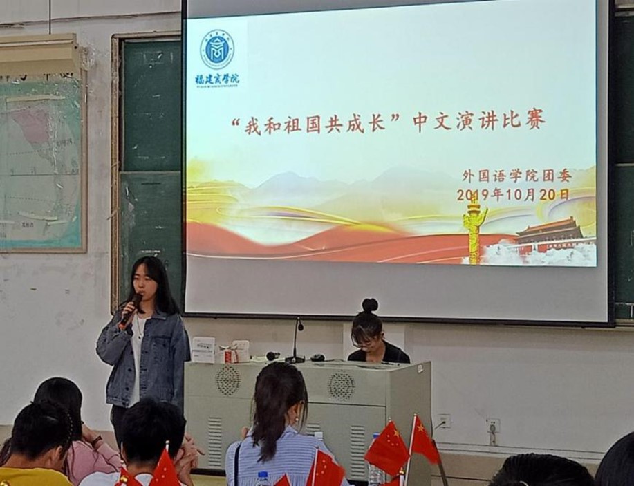 选手们结合自身实践感悟,或讲爱国事迹,或谈新鲜时事,抒发爱国之心、报国之情、强国之志。18级商务英语4班林丽玫同学以时代变迁的视角,畅谈中国通过引进外资、构建社会主义市场体系等方式,逐步走向经济大国,抒发了对伟大祖国的无限热爱,表示自己将不忘初心、牢记使命,拥抱新时代,担当新使命。18级商务英语2班陈熠芝同学通过讲述自己家乡从贫瘠的泥土路到散发着沥青味道的油柏路,从低矮的瓦片房到高大的楼房,切身体会祖国蓬勃发展,她认为新时代中国青年应将爱国奋斗精神转化为实际行动,以青春的热血铸就国之梦想,为祖国发展尽青年之力。