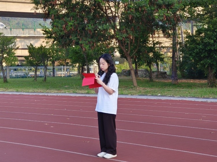 国旗护卫队队员穿着整齐,昂首挺胸,迈着铿锵有力的步伐将五星红旗护送至升旗台。伴随着慷慨激昂的国歌,全体师生代表面向国旗行注目礼,庄严肃立,五星红旗冉冉升起,迎风飘扬。员工代表吴欣雨同学进行了“青春奋进正当时,筑梦不负新时代”主题国旗下讲话,她提到当代青年身处盛世,见证了祖国在科技、经济、文化等方面的繁荣,更应该响应国家号召,汲取奋进力量,展现青年面貌。她呼吁同学们保持强大的定力,立足于专业知识,苦练本领,肩负起中华民族伟大复兴的时代重任,以信心凝聚力量、以实干谱写华章,不断发展自身、成就自身,不负韶华,砥砺前行。同时,值此本科教学合格评估的关键时期,她强调同学们要充分发扬主人翁意识,注重提高自身责任感,做好榜样示范,以团结的姿态和饱满的精神状态迎接本科教学合格评估。