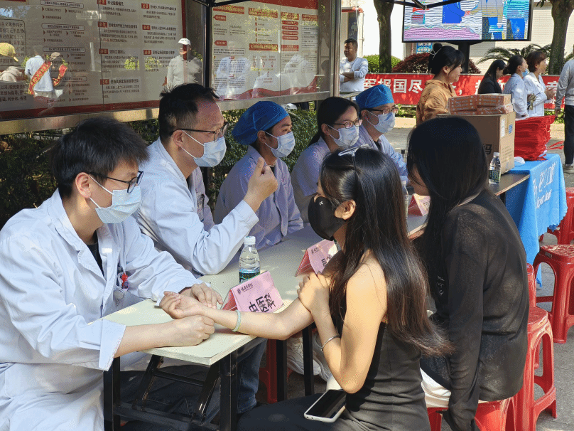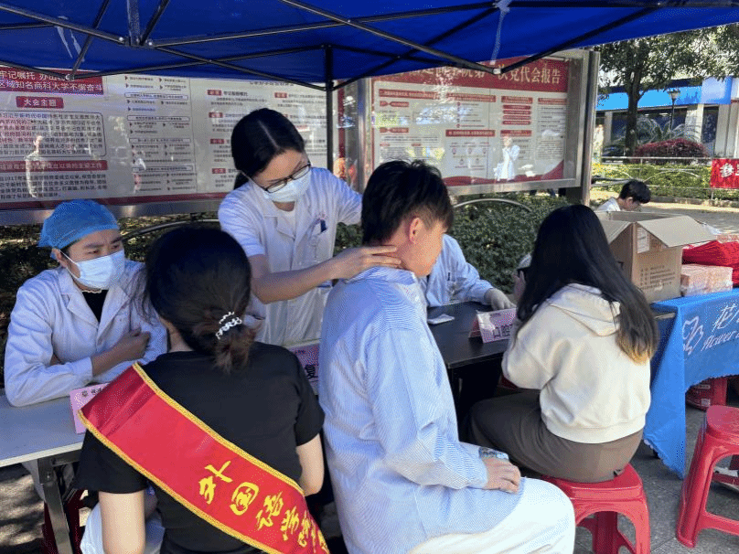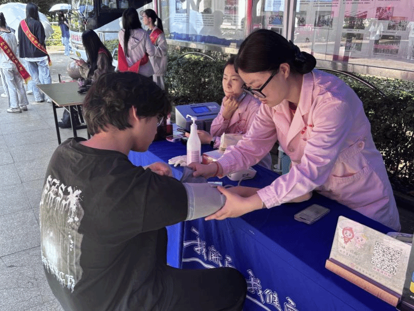 活动现场,前来就诊的师生在义诊摊前有序排队,皮肤科、骨科、康复科等多个科室专家共同坐诊,为师生提供全方位的健康服务。专家们认真细致地为前来问诊的师生辩症施治,进行细致的身体检查。针对各类健康问题,专家们逐一耐心解答,并提供个性化的健康建议。同时在另设的献血区,志愿者们通过发放宣传手册、现场讲解等方式,向师生们科普健康知识,并引导前来鲜血的同学进行体检筛查,在献血结束后为他们提供细致的关心和慰问品,现场洋溢着温馨的氛围。