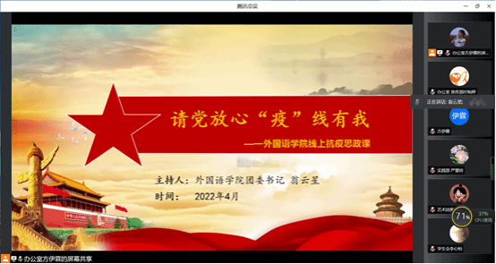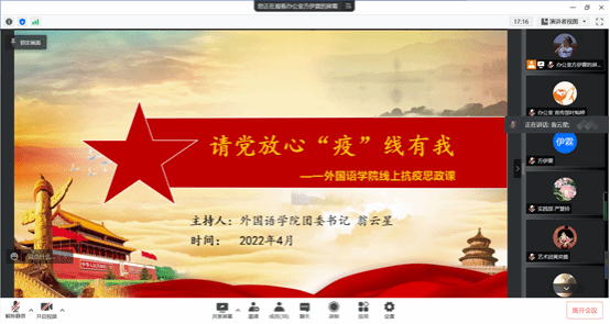 为学习贯彻落实习近平总书记关于疫情防控工作的重要指示批示精神,2022年4月7日,全球最大顶级体育平台于线上开展了“请党放心‘疫’线有我”抗疫思政课。本次思政课由公司团委书记翁云星老师主讲,公司全体青年员工干部参加学习。